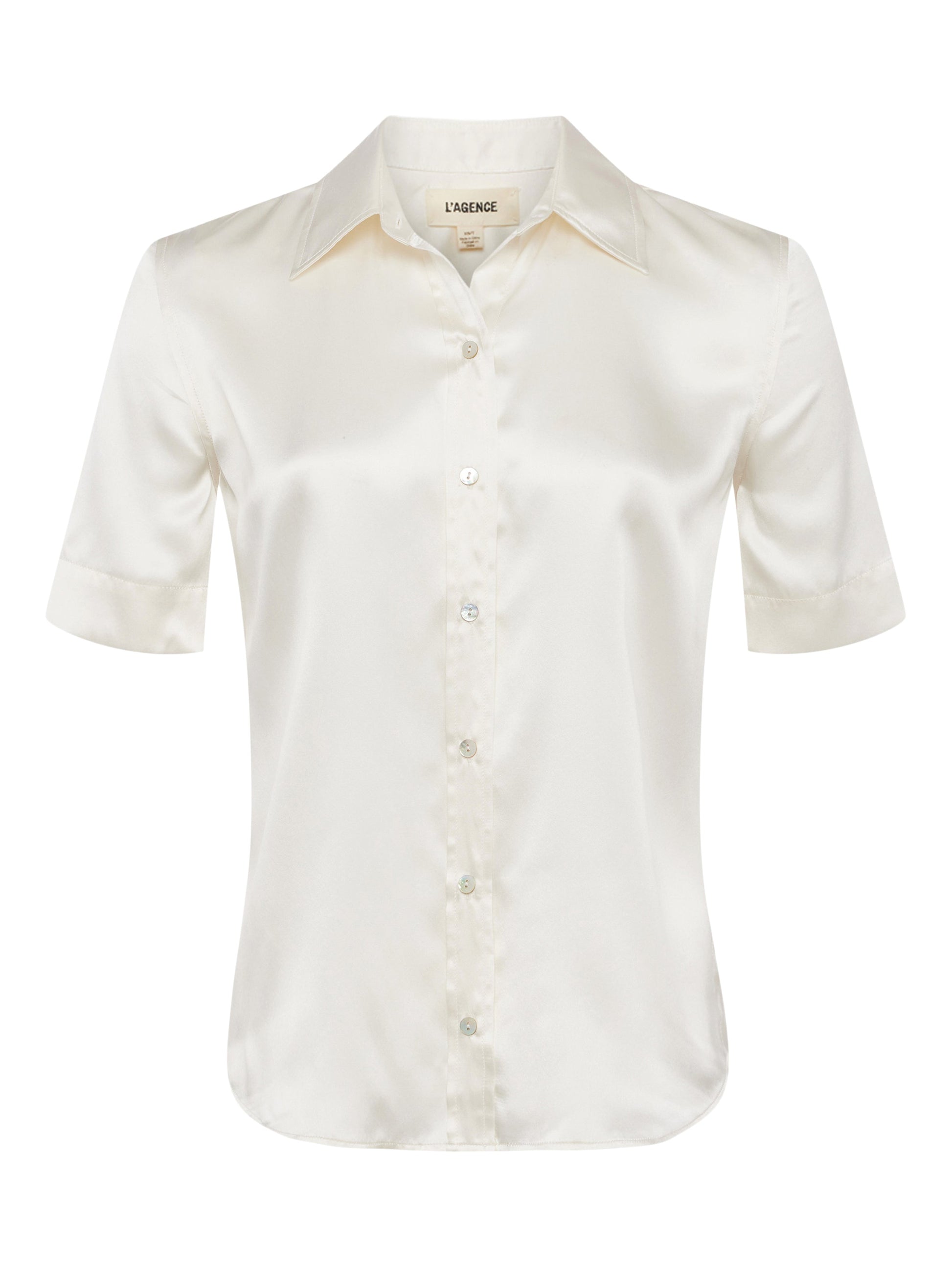 Introducing the short-sleeve version of our signature silk blouse: the Ellah. In lustrous silk charmeuse, she falls effortlessly over the figure for a flattering fit. Shirting details like a trim collar, back yoke and shirttail hem keep her timeless. Pair with denim for instantly elevated style.