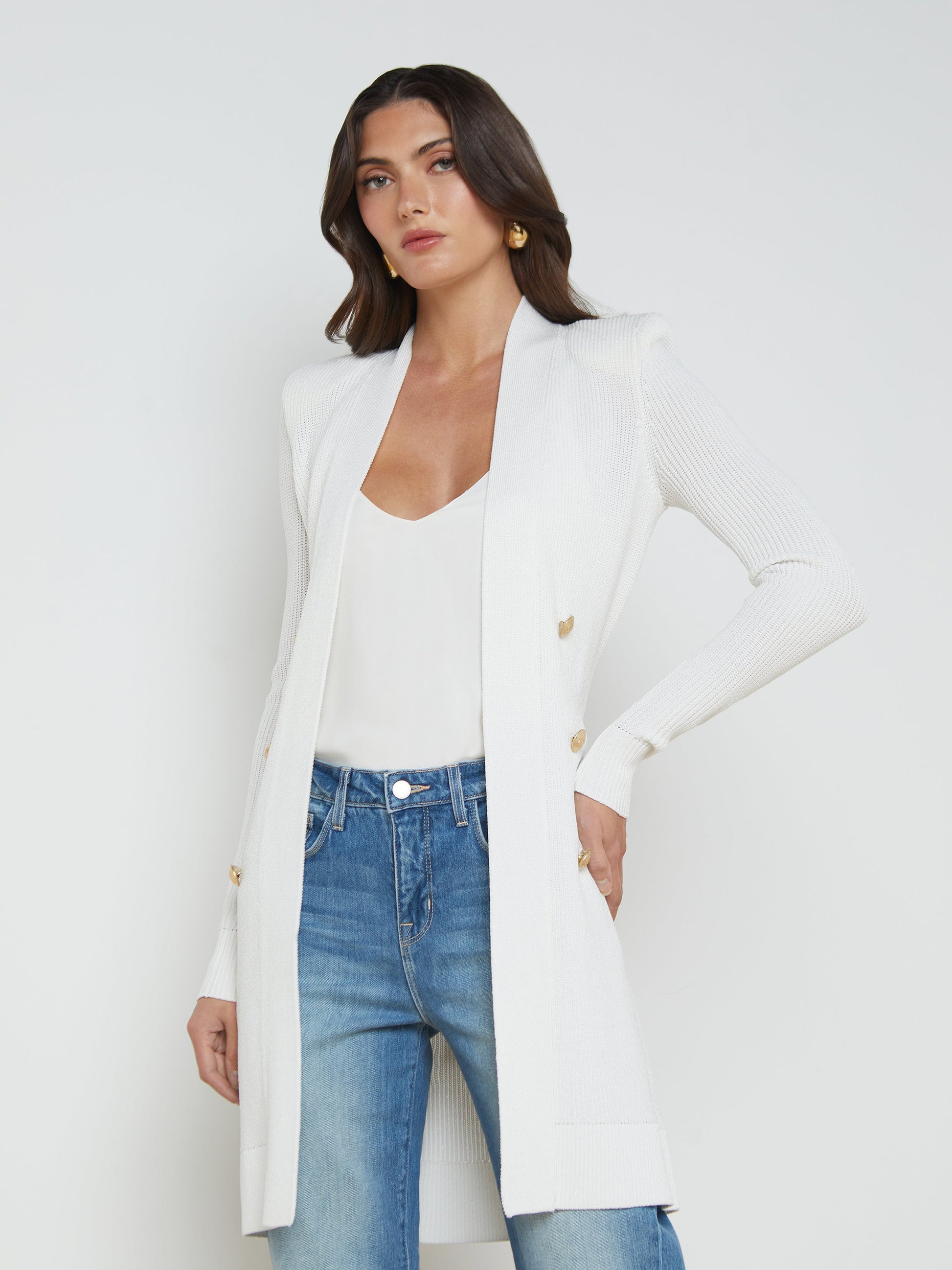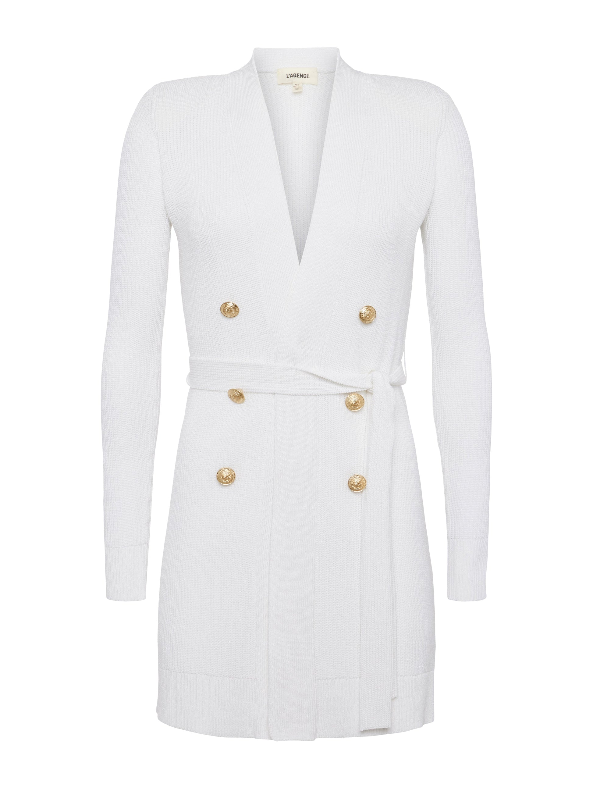 Effortlessly chic and ultra-wearable, she's our bestselling rib-knit cardigan, and now offered in pure white with a hint of lurex. Our double-breasted Noe tapers from strong shoulder to waist before falling to mid-thigh, for a flattering, defined silhouette. Tie belt enhances hourglass definition. Finished with our signature embossed-dome accent buttons. Pair with denim for a pulled-together weekend look.
