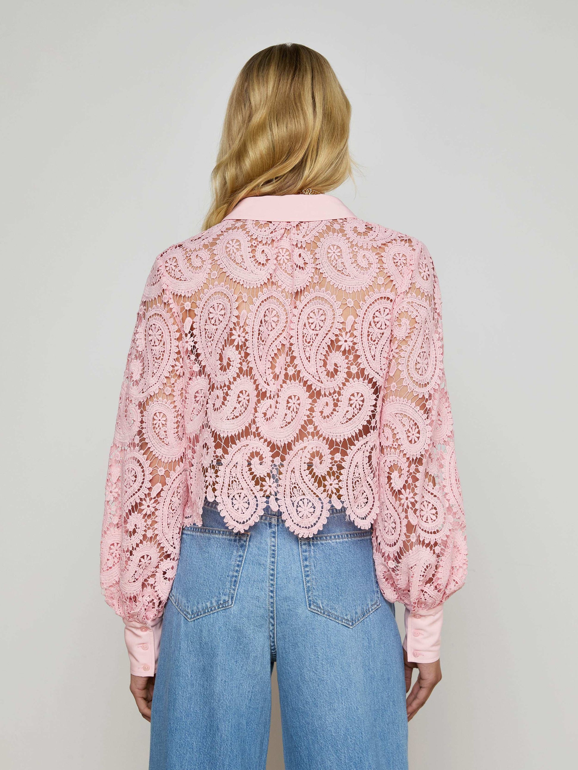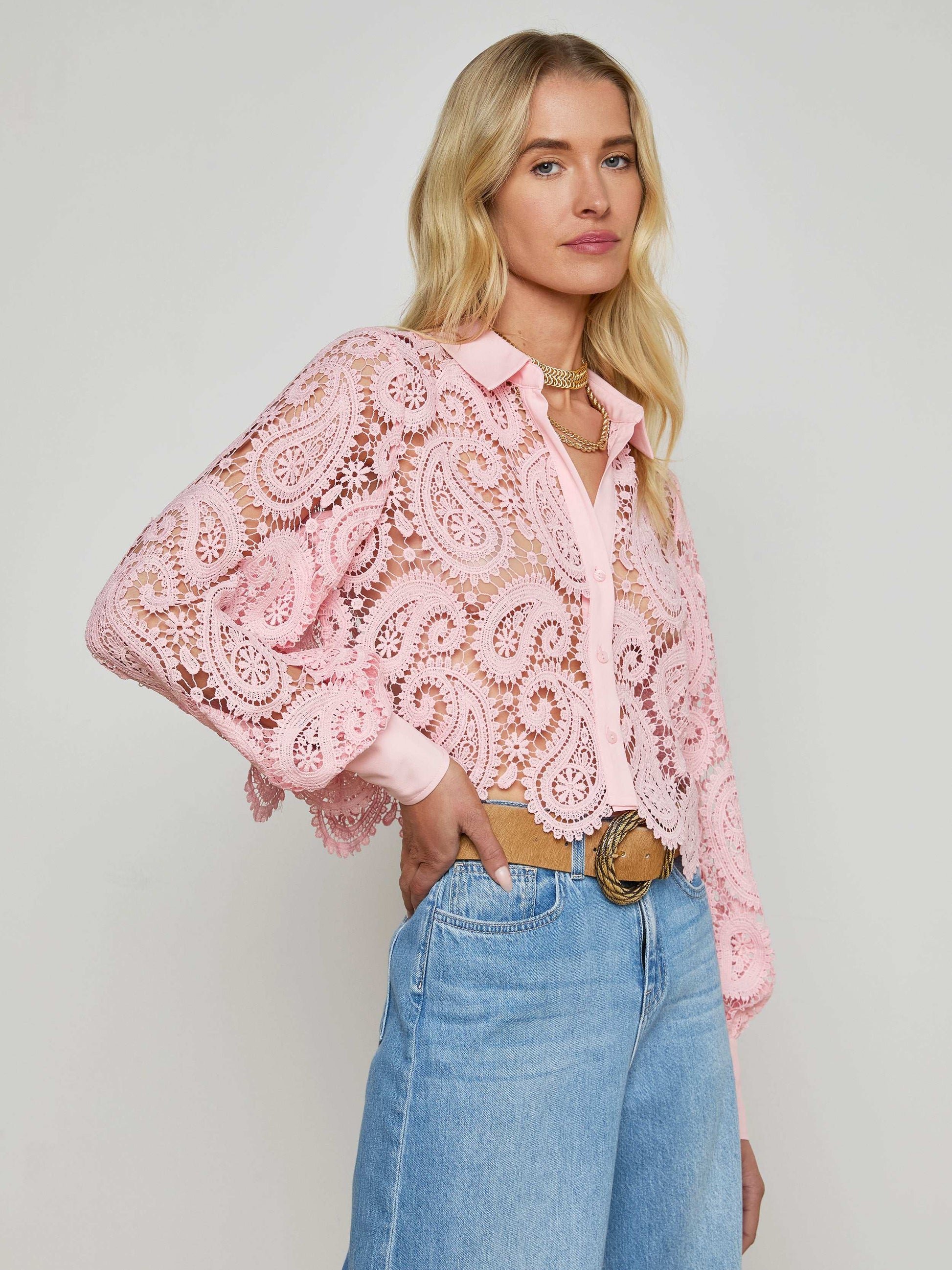A cropped lace blouse featuring an intricate paisley pattern, a relaxed fit, and scalloped hem. Wear the Odelia layered over a camisole now and over a swimsuit later.