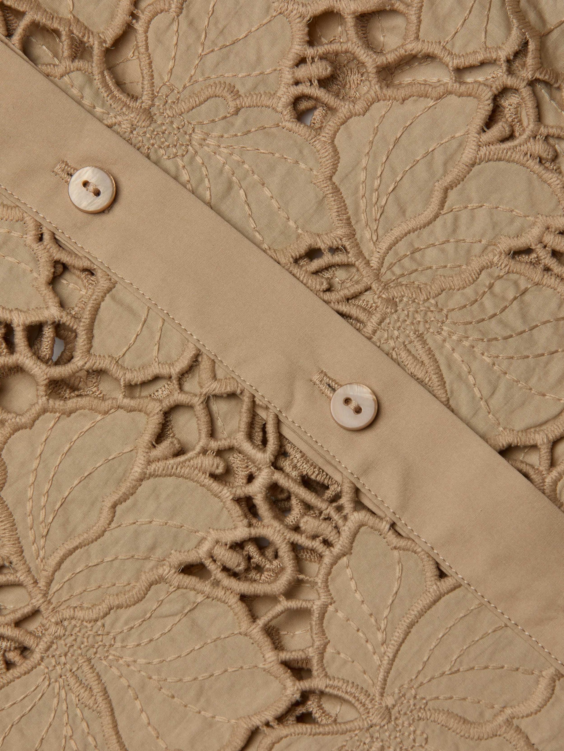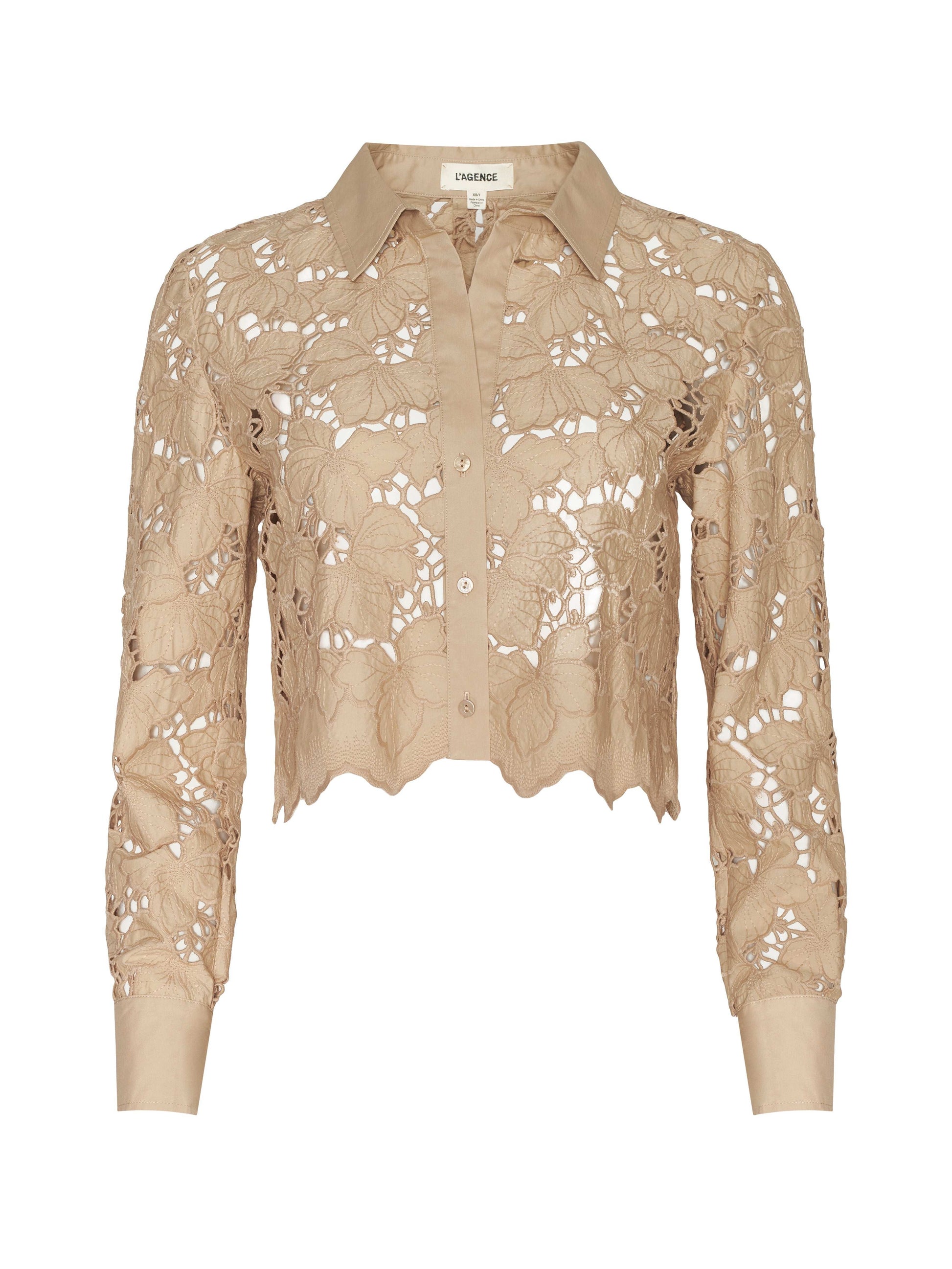 Our modern spin on a lace blouse, the Seychelle delivers classic shirting details in a cool cropped cut. Now in a neutral almond.