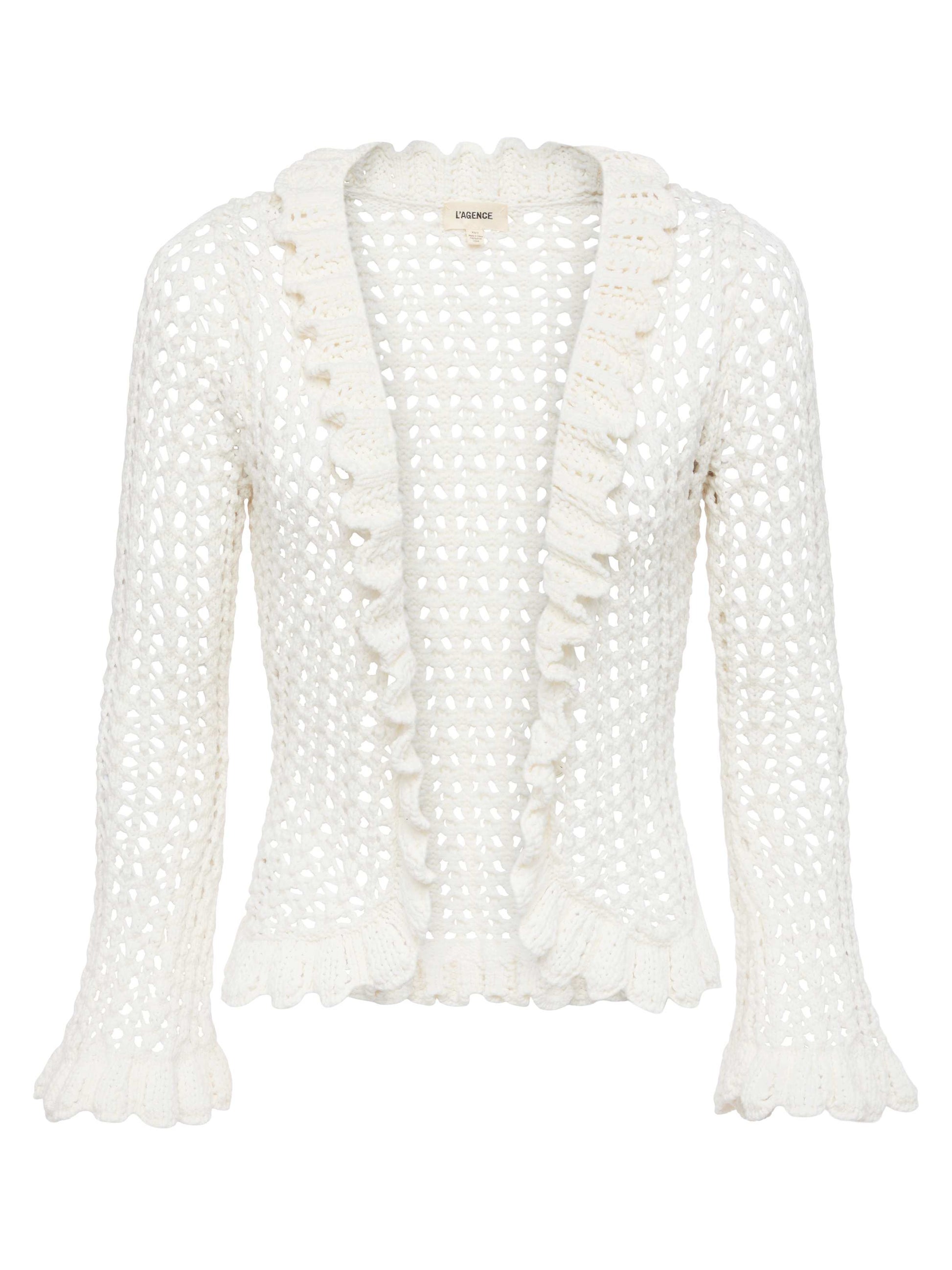 Summer, in a knit. Feminine and airy, the Solaris is an open-stitch crochet cardigan finished with delicate ruffled trims. Now in ivory, she’s the lightweight layer you’ll want to wear all season. Throw it on over a bikini or pair it with a camisole and jean shorts.