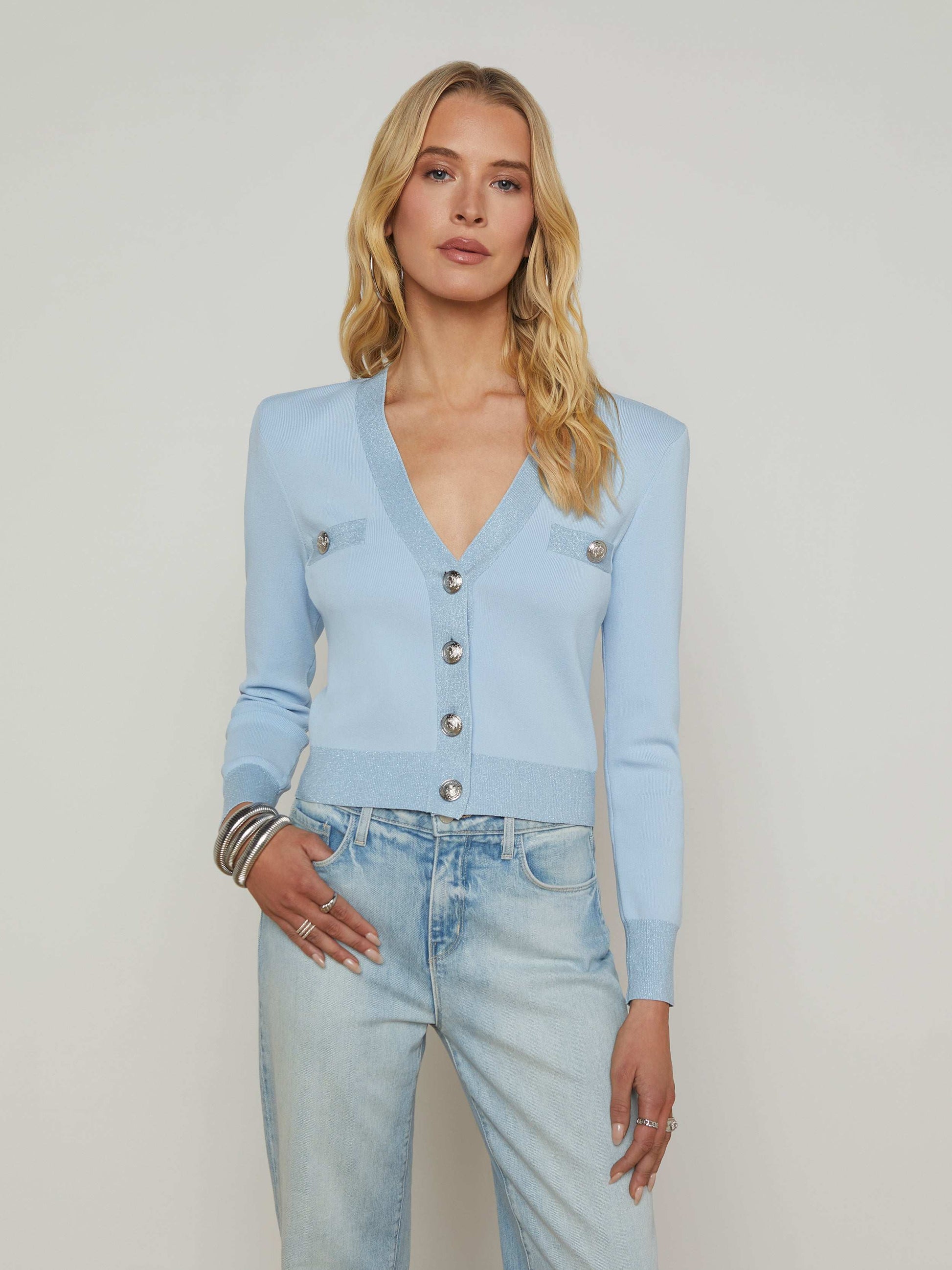 Our chic Parisian-inspired cardigan, now in blue. Wear the Taya as a top or second layer all season, every season.